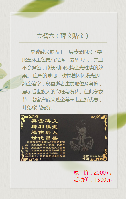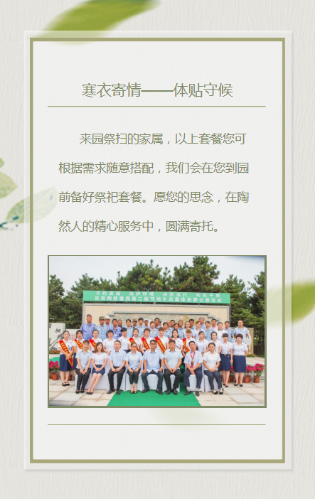 正值寒衣節(jié)來臨之際,沈陽陶然寢園貼心的為前來掃墓客戶準(zhǔn)備了祭祀套餐活動(dòng),最大限度的省去了各位的時(shí)間和不必要的麻煩。