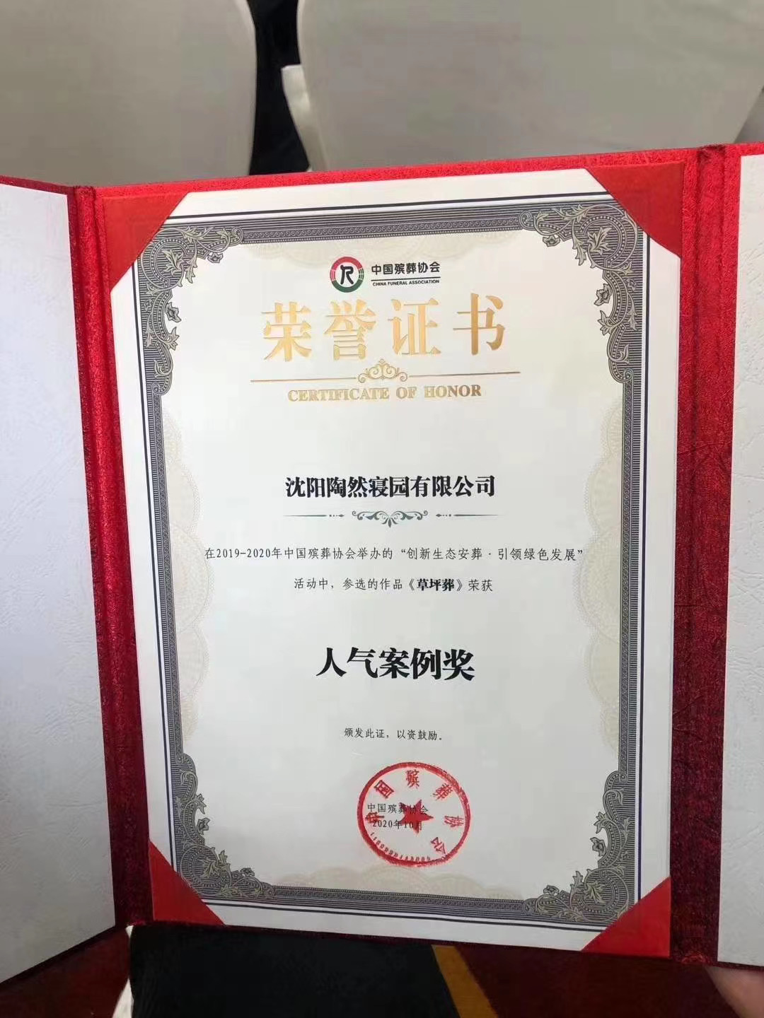 “生態葬”的評比剛剛落下帷幕,在全國網絡投票中,沈陽陶然寢園草坪葬獲得全國第九名,并榮獲“人氣案例獎”,感謝大家的支持。